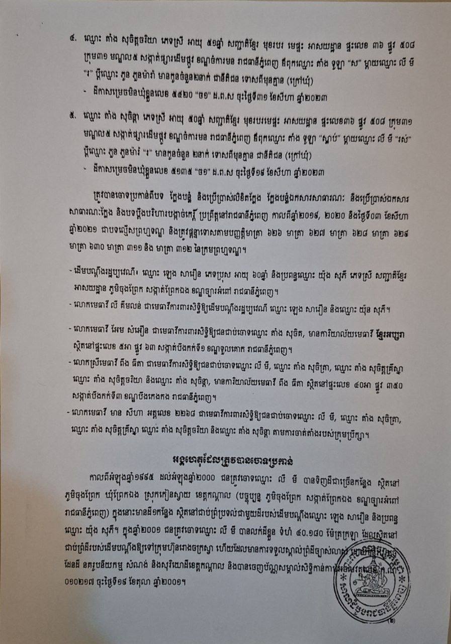 នៅថ្ងៃទី៣ ខែសីហា ឆ្នាំ២០២១ សាលាដំបូងរាជធានីភ្នំពេញ បានជំរះសម្រេចចេញជាសាលក្រមក្នុងសនុំរឿងព្រហ្មទណ្ឌឲ្យឈ្មោះ ឡេង សារឿន ឈ្នះដោយបានរួចផុតពីបទចោទរបស់ឈ្មោះ លី ម៉ី និងកូនៗ។ បន្ទាប់មកនៅខែតុលា ឆ្នាំ២០២១ លោក ឡេង សារឿន ដែលជាម្ចាស់ដី និងជាអតីតយុទ្ធជនពិកា បានប្ដឹងឈ្មោះ លី ម៉ី និងកូនៗចំនួន ៤នាក់ទៀត ទៅសាលាដំបូងរាជធានីភ្នំពេញពីបទក្លែងបន្លំឯកសារ ប្រើប្រាស់ឯកសារក្លែងបន្លំលួចយកដី។ លោកថា ការដោះស្រាយរបស់តុលាការទៅតាមនិតិវិធីច្បាប់ ប៉ុន្តែដោយភាគីចុងចោទតែងតែរកលែសនេះលែសនោះនិងរកលោកនេះលោកនោះមកជួយអន្តរាគមន៏ជាមួយតុលាការនាំអោយដំណើរការនិតិវិធីច្បាប់នេះមានការយឺតយ៉ាវផ្តល់យុត្តិធម៌ជូនរូបលោក នៅថ្ងៃទី ៦ មករា ២០២៥ ទើបរូបលោក បានសម្រេចចិត្តធ្វើពាក្យបណ្ដឹងគោរពស្នើសុំកិច្ចអន្តរាគមន៏ពីសម្ដេចតេជោ ប្រធានព្រឹទ្ធសភា និងជាប្រមុខរដ្ដស្ដីទី។ ហើយនៅថ្ងៃ ១៤ មីនា ២០២៥ ព្រឹទ្ធសភា បានចេញលិខិតជំរាបជូនទៅ ឯកឧត្តម ឧបនាយករដ្ឋមន្ត្រី និងជារដ្ឋមន្រ្តីក្រសួងយុត្តិធម៌ កើត រិទ្ធ ហើយនៅថ្ងៃទី៤ មេសា ២០២៥ ឯកឧត្តម រដ្ឋមន្ត្រីក្រសួងយុត្តិធម៌ និងជាប្រធានគណ:បញ្ជាការដឹកនាំយុទ្ធនាការ បានចេញលិខិតជម្រាបជូនឯកឧត្ដម នួន ណារ៉ា ប្រធានសាលាដំបូងរាជធានីភ្នំពេញ ដើម្បីជំរុញចំណាត់ការលើសំនុំរឿងអោយបានឆាប់រហ័ស និងត្រឹមត្រូវតាមនិតិវិធីច្បាប់ ទើបនៅថ្ងៃទី៧ ខែសីហា ឆ្នាំ២០២៥ សាលាដំបូងរាជធានីភ្នំពេញ បានជំនុំជំរះសម្រេចចោទប្រកាន់ឈ្មោះ លី ម៉ី និងកូនប្រុសឈ្មោះ តាំង សុចិត្តគ្រឹស្នា ជាប្រធានមន្ទីរទេសចរណ៍ខេត្តព្រះសីហនុ កូនប្រុសម្នាក់ទៀតឈ្មោះ តាំង សុចិត្រា ជាអគ្គនាយករង នៃអគ្គនាយកដ្ឋានទឹកស្អាត ព្រមទាំងកូនស្រី២នាក់ ឈ្មោះ តាំង សុចិត្តចរិយា ឈ្មោះ តាំង សុចិន្តា ឱ្យជាប់ពន្ធនាគារក្នុងមួយនាក់ ១ឆ្នាំ ៦ខែ(ដោយពុំមានការព្យួ) ក្នុងសំនុំរឿងព្រហ្មទណ្ឌខាងលើ និងពិន័យប្រាក់ ២០លានរៀល។