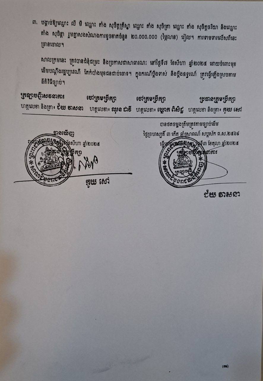 ជុំវិញករណីខាងលើ អង្គភាពសារព័ត៌មានយើងខ្ញុំ ពុំអាចទាក់ទងសុំការបំភ្លឺពីឈ្មោះ លី ម៉ី និងលោក តាំង សុចិត្រា បាននោះទេដោយពុំមានលេខទូរសព្ទ។ អង្គភាពសារព័ត៌មានយើងខ្ញុំ រង់ចាំការបកស្រាយបំភ្លឺពីគ្រប់ភាគីពាក់ព័ន្ធរៀងរាល់ម៉ោងធ្វើការ ស្របតាមច្បាប់របស់សារព័ត៌មាននៃព្រះរាជាណាចក្រកម្ពុជា៕